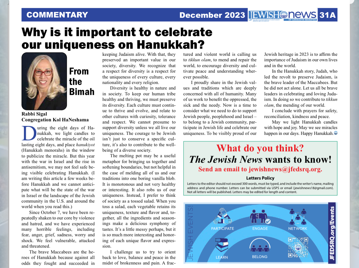 Dear Friends, I write to you with great excitement and anticipation as the new Kol HaNeshama rabbi. It is truly an honor to serve you in this sacred role, and I am filled with gratitude for the opportunity to connect with each and every one of you and bring the community together in meaningful and Continue Reading »